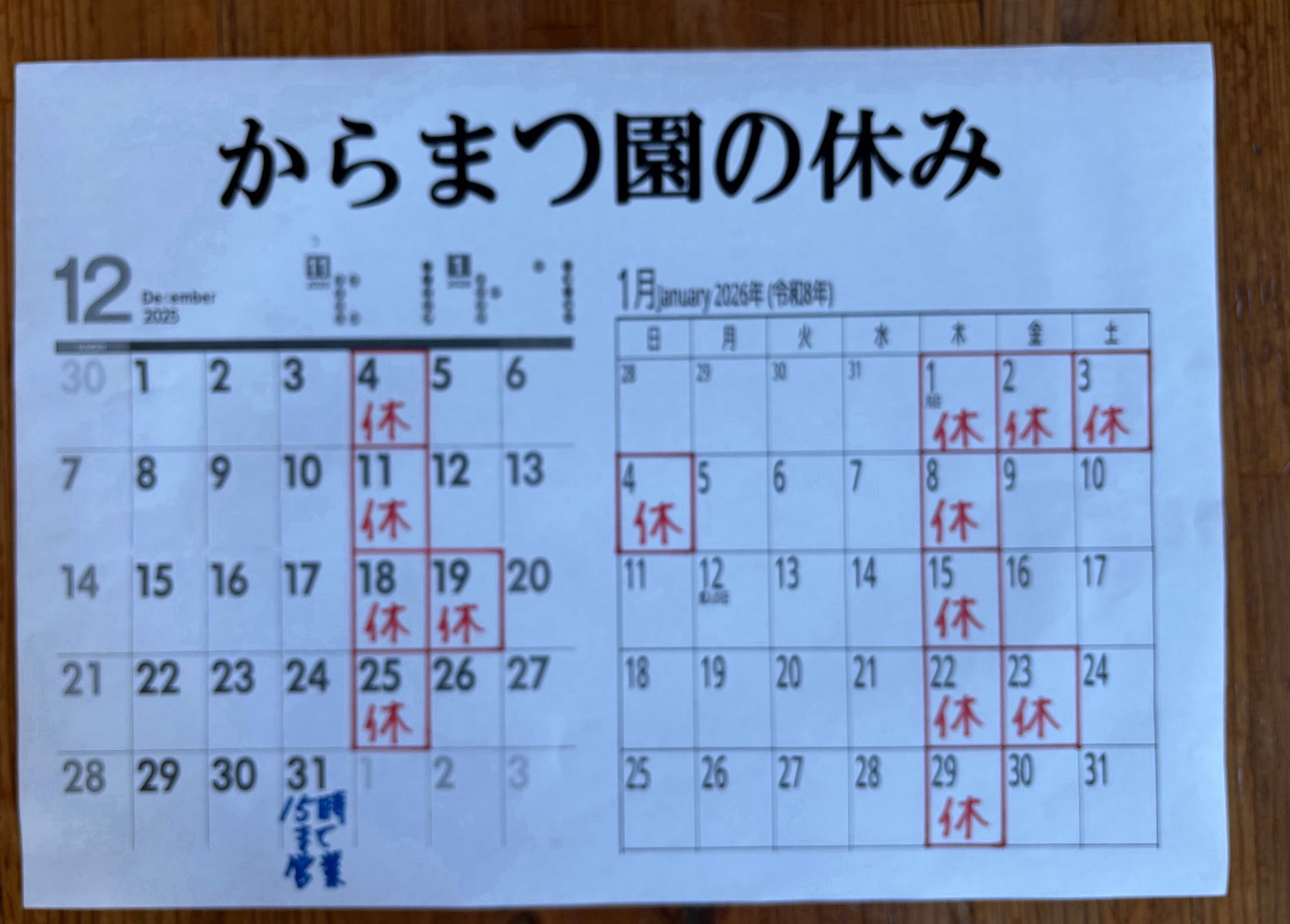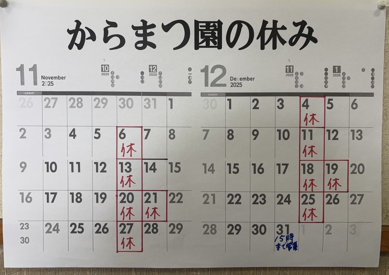 毎週 木(もく)曜日定休日